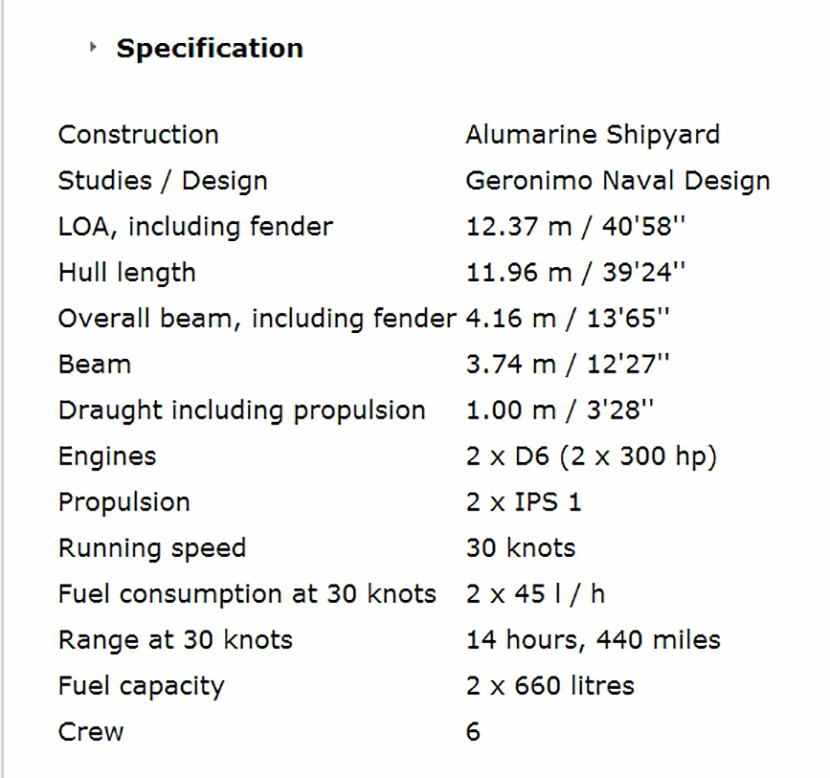發動機功率: | 2×250hp | 推進裝置: | 2×IPS1 |