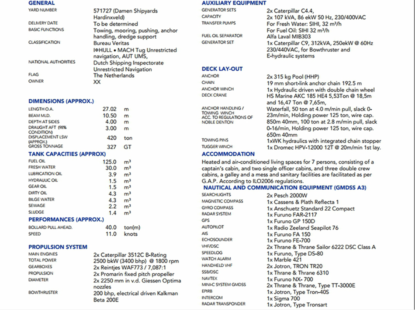 發電機組: | 2×Caterpilar 3512B | 齒輪箱: | 2×Reintjes WAF 773L |