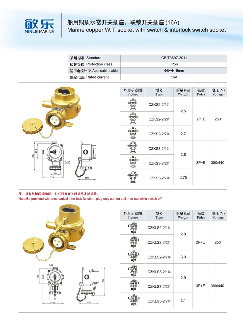 船用銅質(zhì)水密聯(lián)鎖開(kāi)關(guān)插座(16A) | |||
