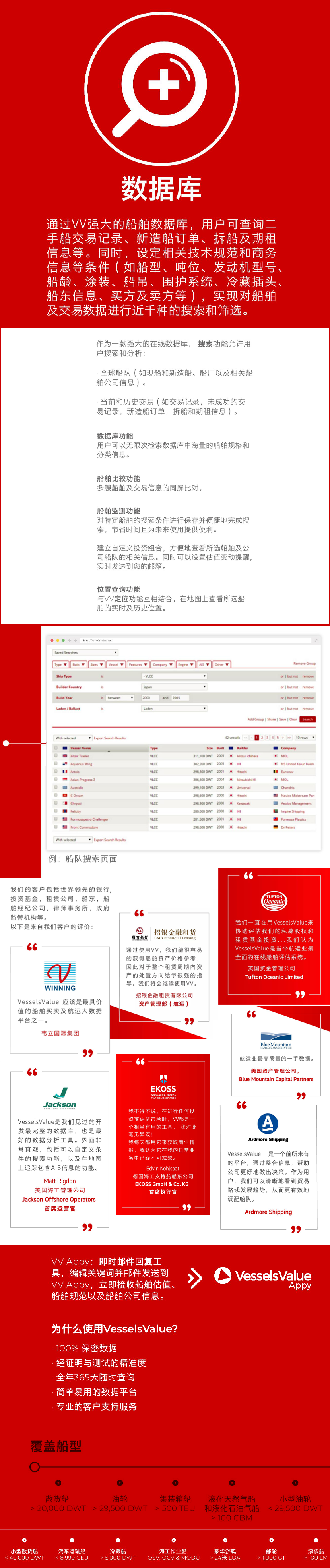 數據報告: | 可定制 | 其他優勢: | 搜索船舶維度豐富,如“船隊、船舶配置規格、交易方信息等”;自定義投資組合,高效查看目標船隊及船舶信息 |