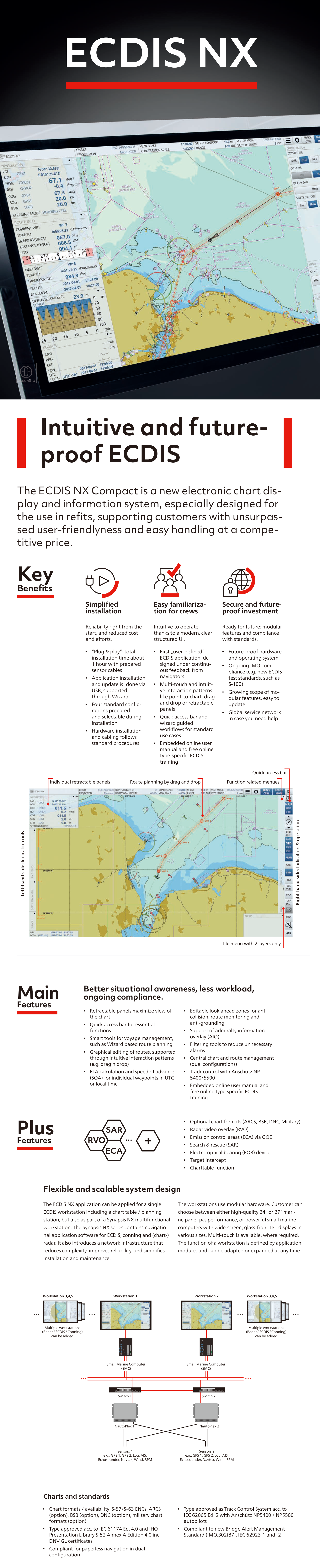 性能亮點: | Advanced functions (known from “INS”) significantly contribute to safe navigation and efficient watchkeeping; Modular features and compliance with standards; Smart tools for voyage management; Compliant for Paperless Navigation; Compliant to new Bridge Alert Management; Flexible and scalable system design |